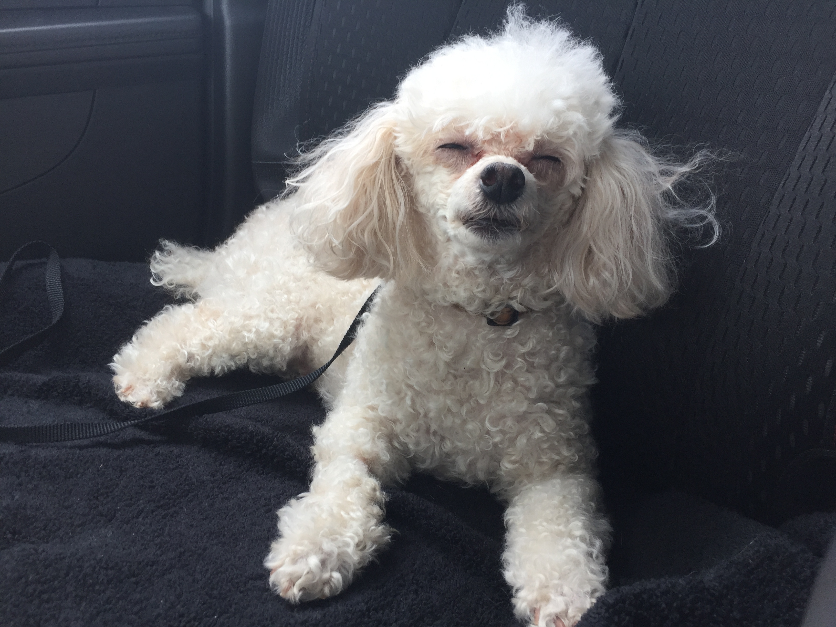 Last week, Sancho, my toy poodle, had mouth surgery to remove three teeth and a tumor. (The biopsy was negative. Yay!) The vet arranged for me to pick him up as soon as he regained consciousness, because last time didn’t go so well.